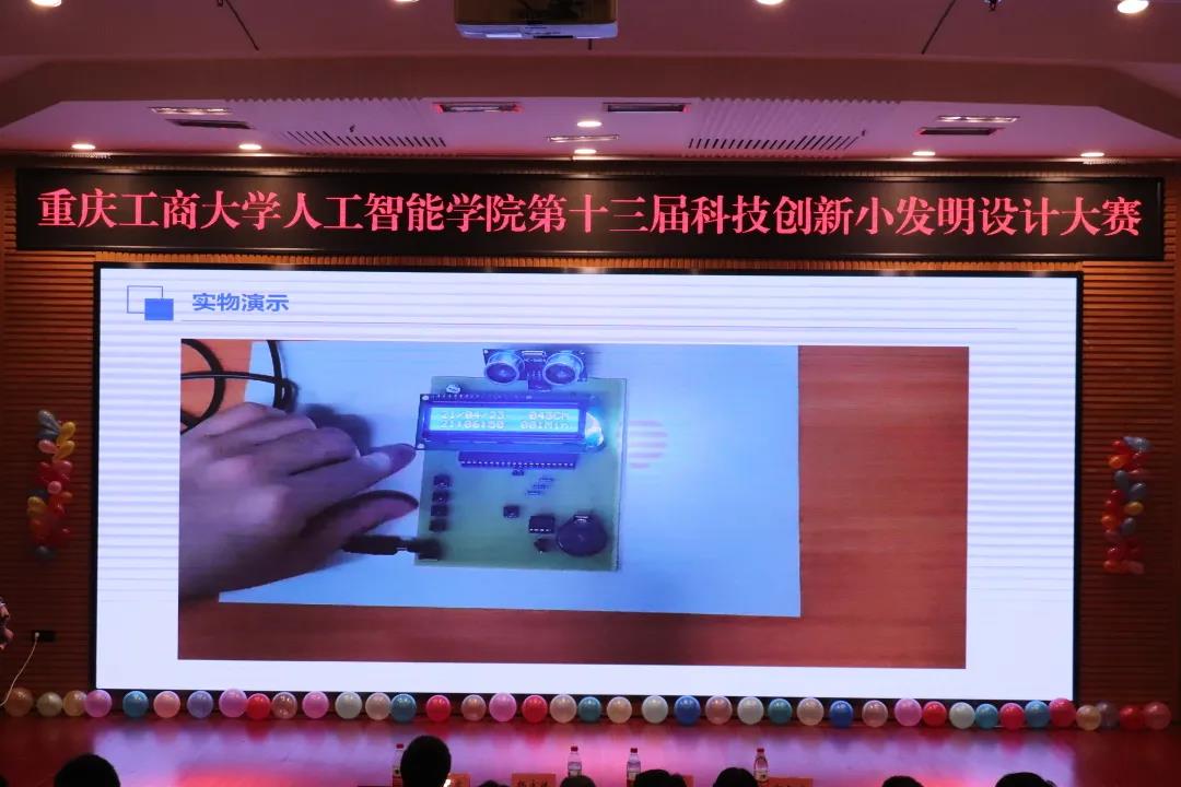 创新谋发展,突破无止境!为培养同学们的团队合作精神、学习交流能力,提升同学们的创新思维、动手实践能力,彰显当代大学生的创新能力,重庆工商大学永利集团3044am于4月23日19:00在南岸主校区7200举办了第十三届科技创新小发明决赛。本次比赛由杜俊成、王晓滢主持,永利集团3044am计算机系主任杨永斌副教授、计算机系杨艺副教授、测控自动化系副主任范兴容博士、电子系郭智威博士出席并担任比赛的评委。