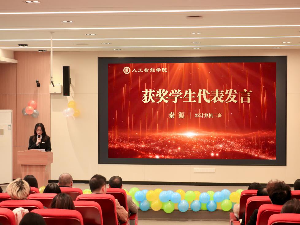 颁奖典礼上,颁奖嘉宾依次为获奖同学和集体授牌、颁奖,来自22级计算机二班的秦源同学代表获奖者发言。