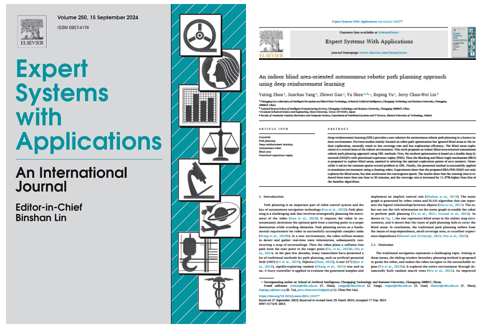 我校永利集团3044am硕士研究生周雨婷在机器人自主路线规划方面取得了新进展,研究成果“An Indoor Blind Area-Oriented Autonomous Robotic Path Planning Approach Using Deep Reinforcement Learning”(面向室内盲区基于深度强化学习的机器人自主路径规划方法)在智能系统领域国际知名期刊《Expert Systems With Applications》(中科院1区Top)在线刊出(DOI:10.1016/j.eswa.2024.124277)。