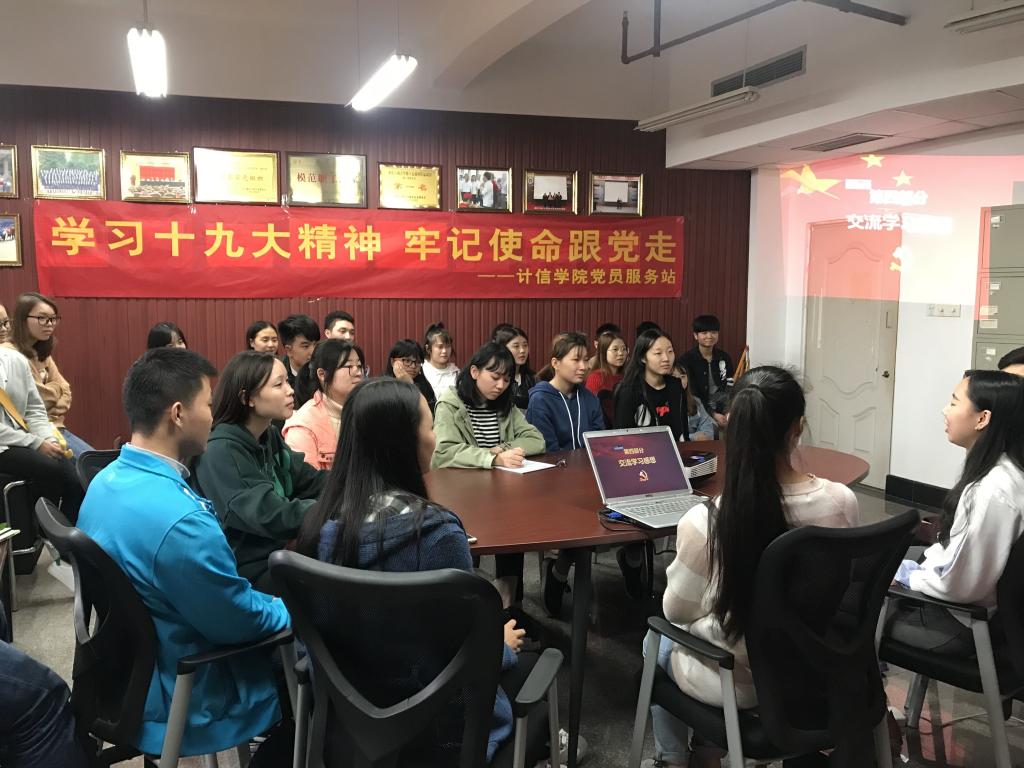 2017年10月27日上午,计算机科学与信息工程学院党员服务站在慧智楼90805召开了学习交流会,集中学习十九大精神。学院党员服务站指导老师李菁以及三十余名党服各职能部门学生干部参加了会议。